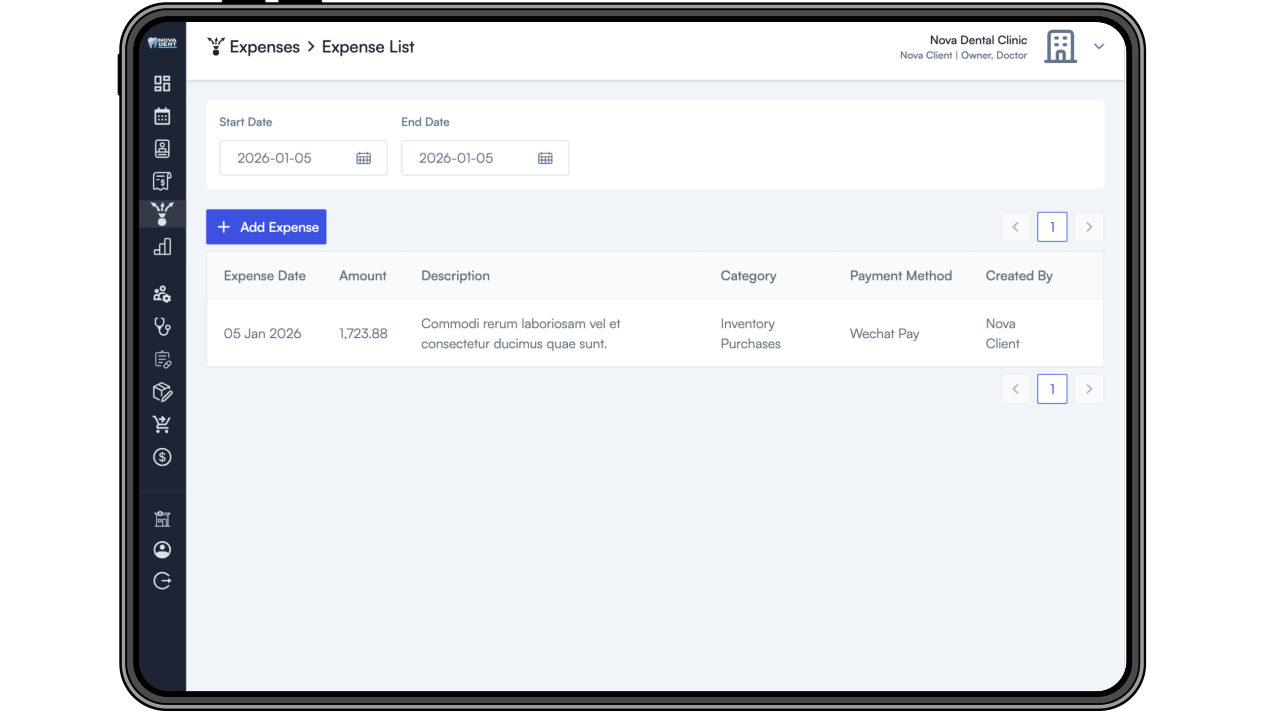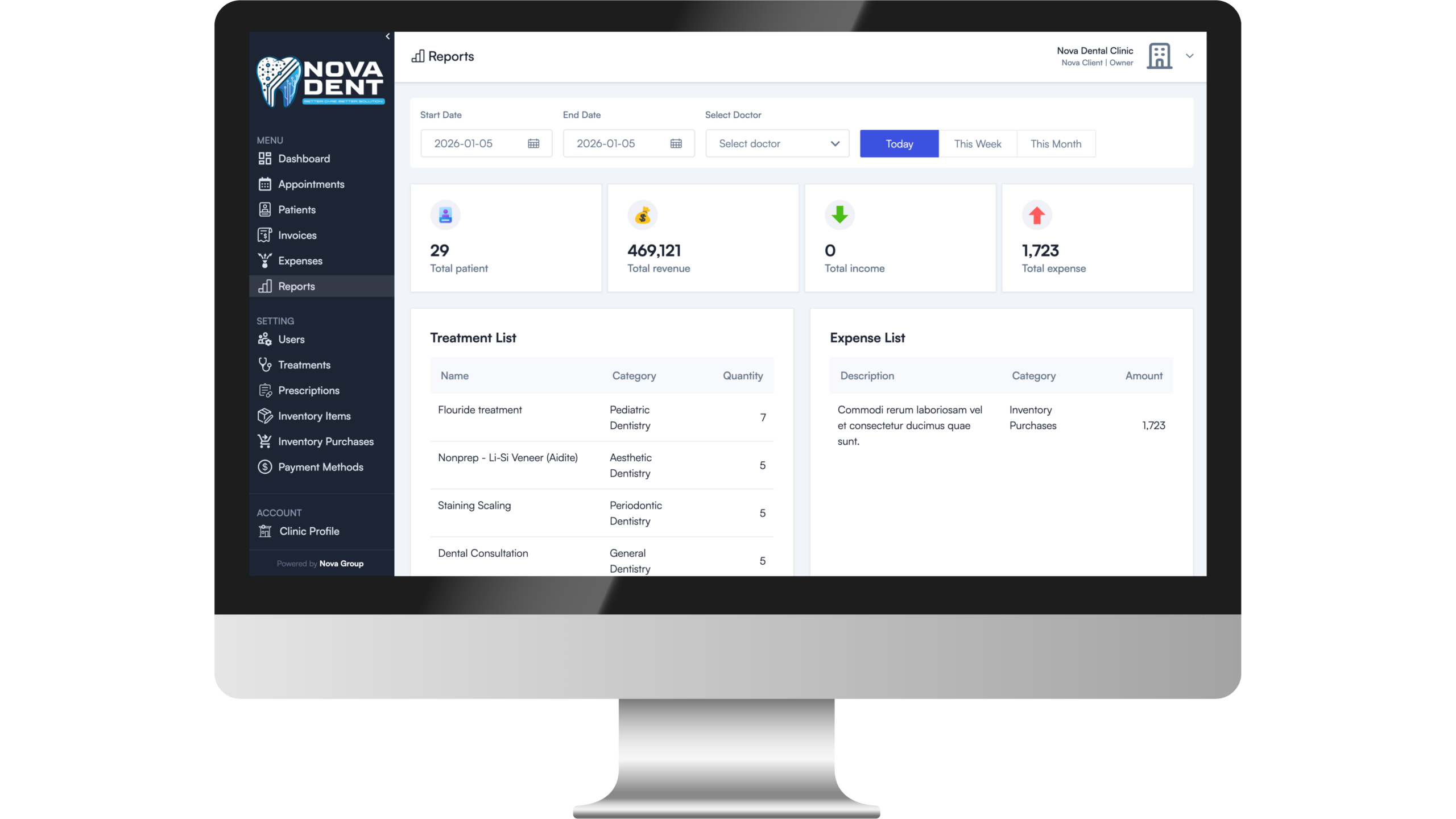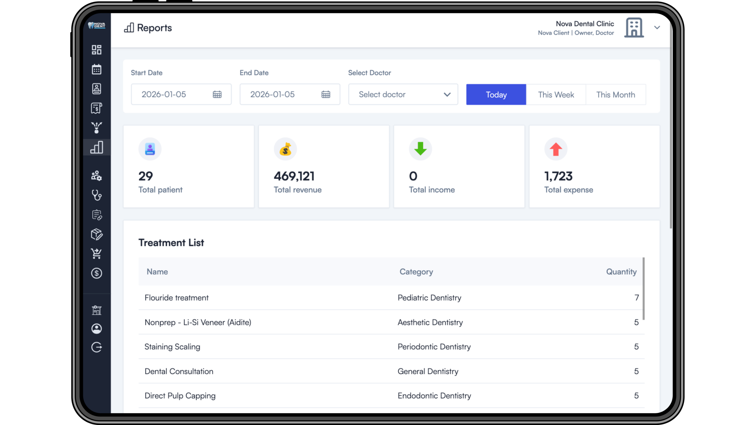Nova Dent’s Reports page provides a clear overview of clinic performance, including total patients, revenue, income, and expenses. Users can filter reports by date and doctor, and quickly review treatment and expense summaries for better financial and operational insights.