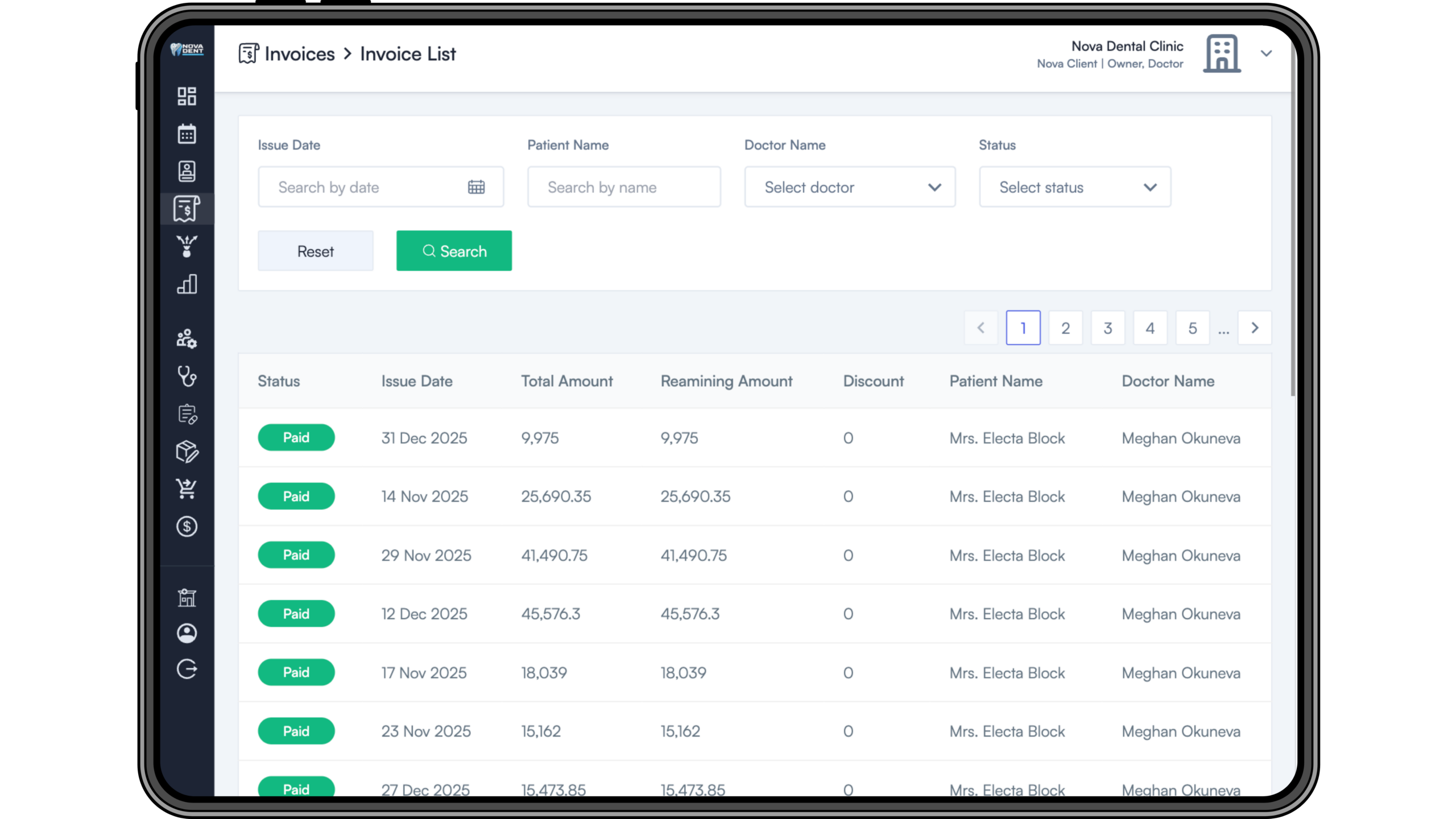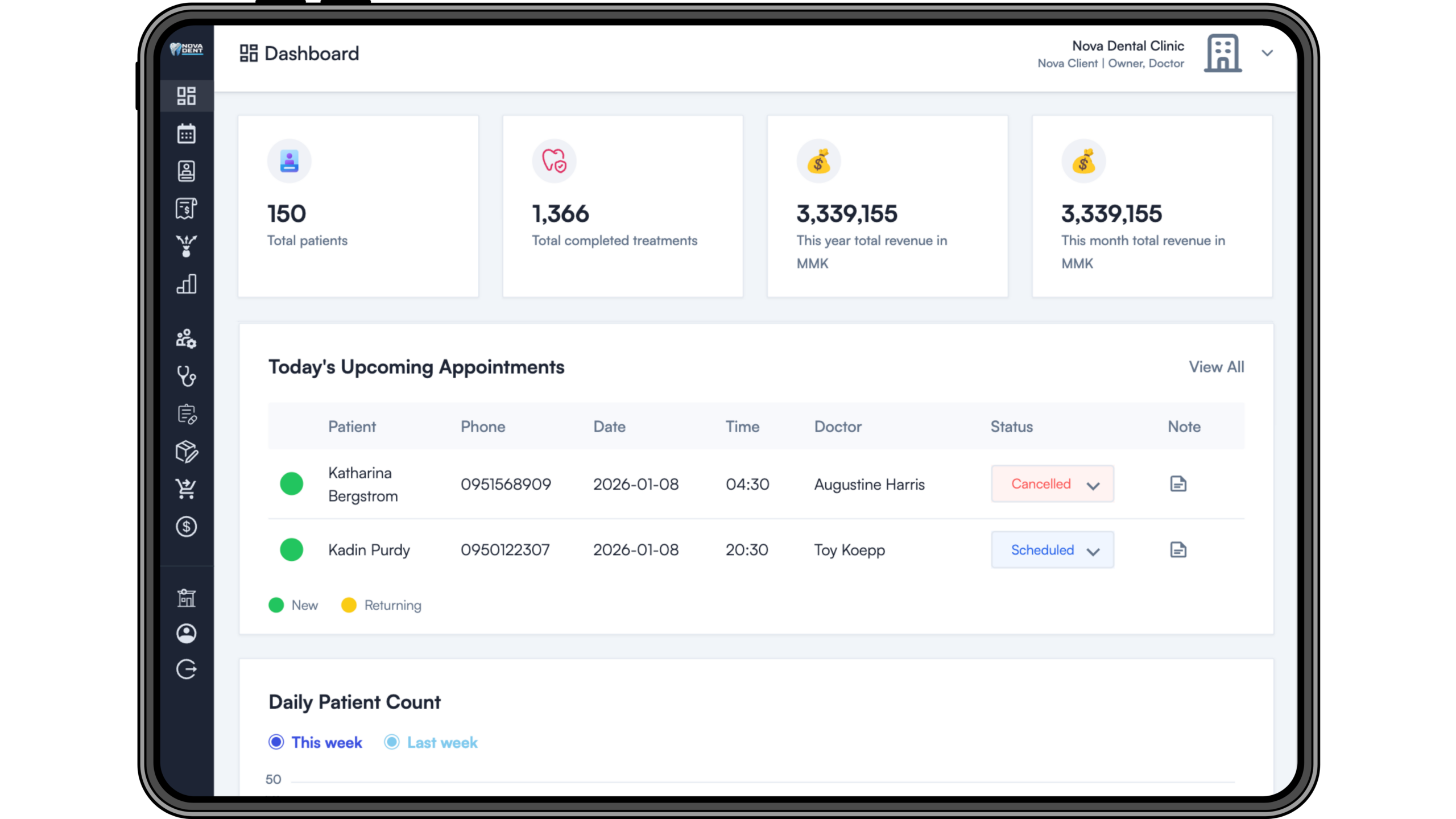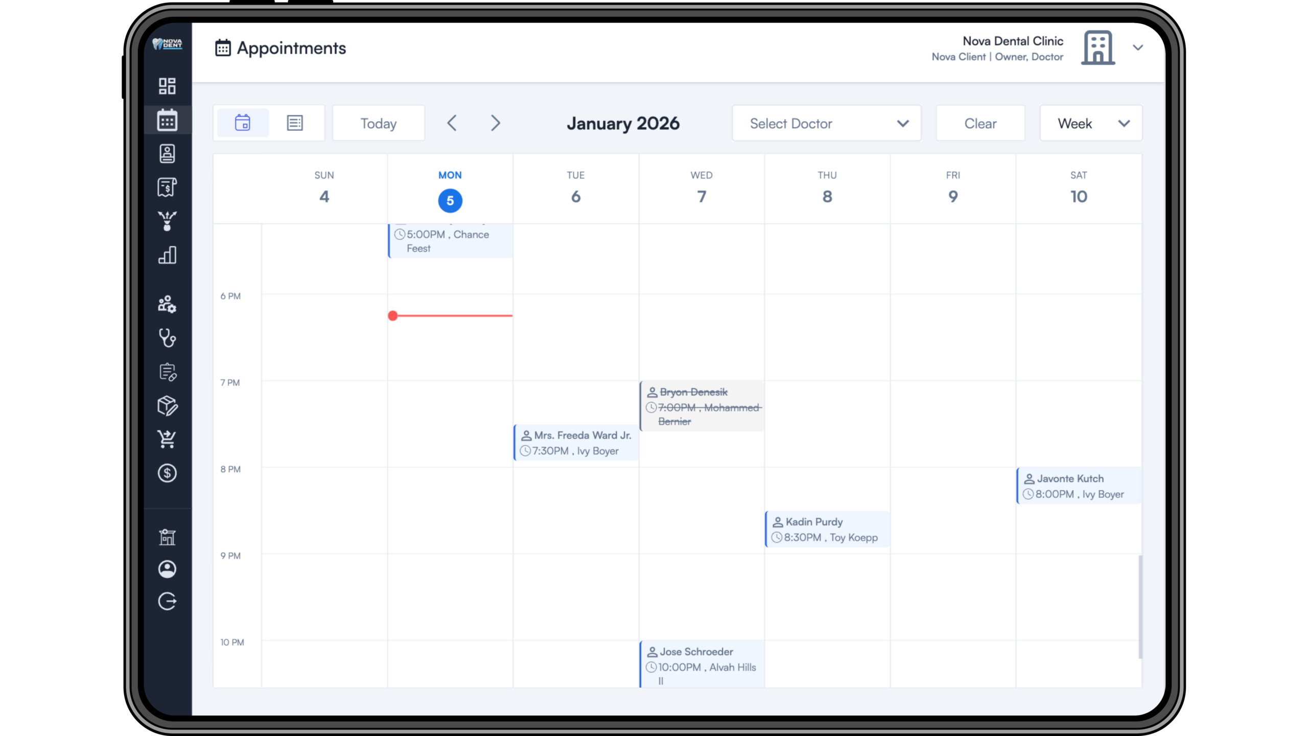 Nova Dent’s appointment calendar provides a clear, organized view of daily and weekly schedules. Clinics can easily manage bookings, filter appointments by doctor, and navigate dates with an intuitive calendar layout, helping ensure smooth scheduling and efficient time management.