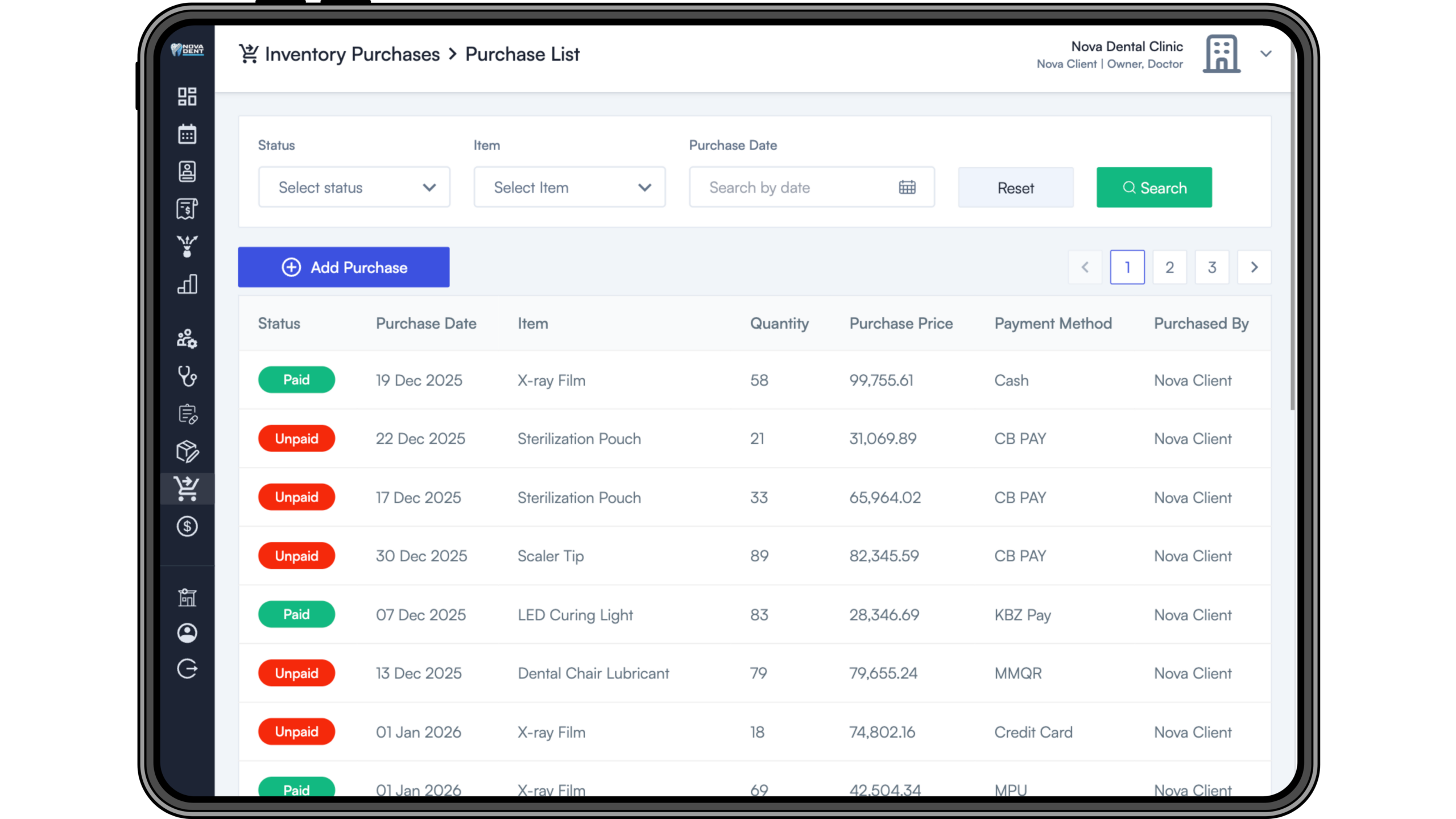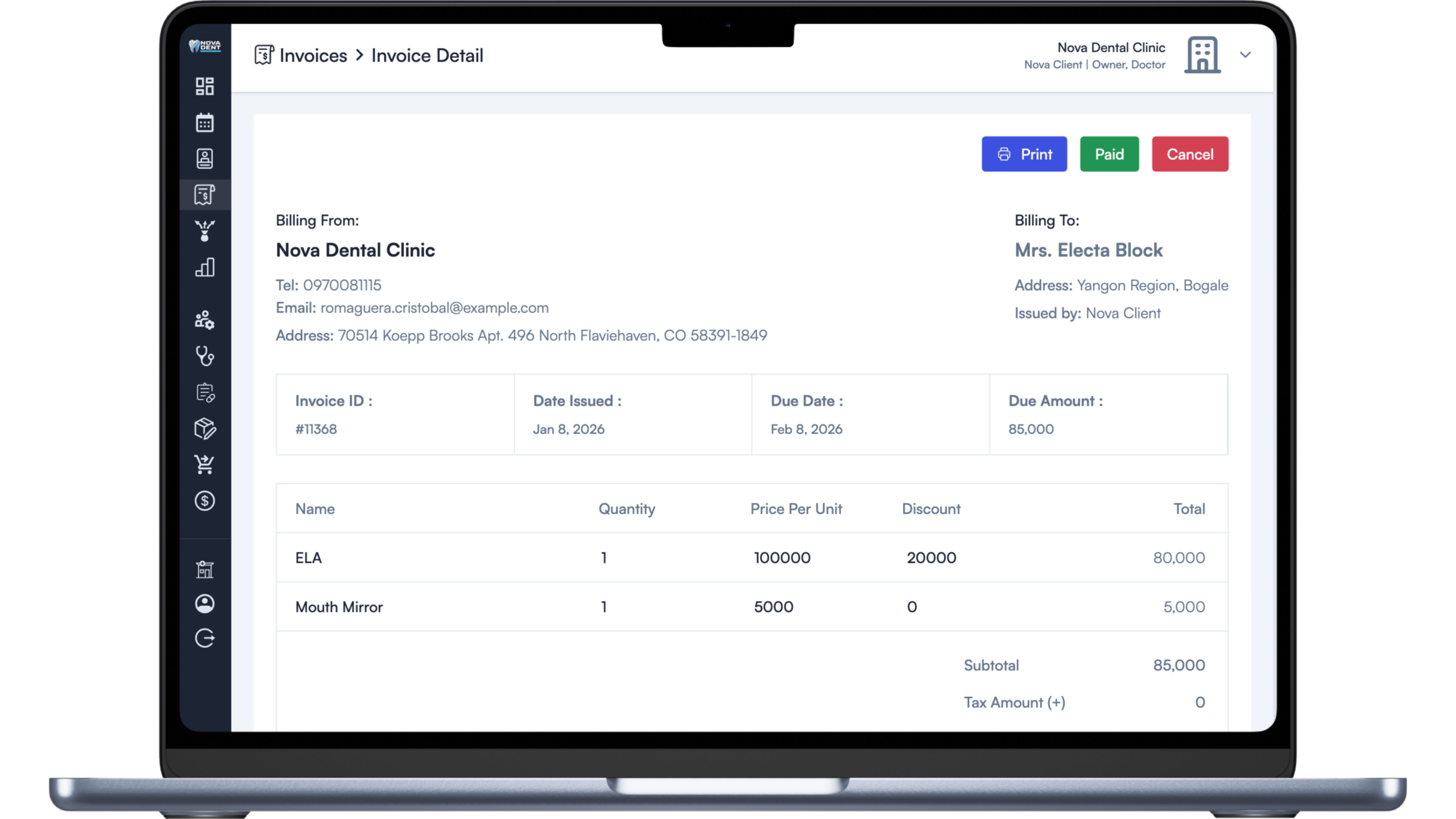 Nova Dent’s invoice detail page provides a clear and professional breakdown of billing information. Clinics can easily view itemized treatments, discounts, taxes, and payment status, while supporting multiple payment methods and instant invoice printing for smooth and transparent billing.