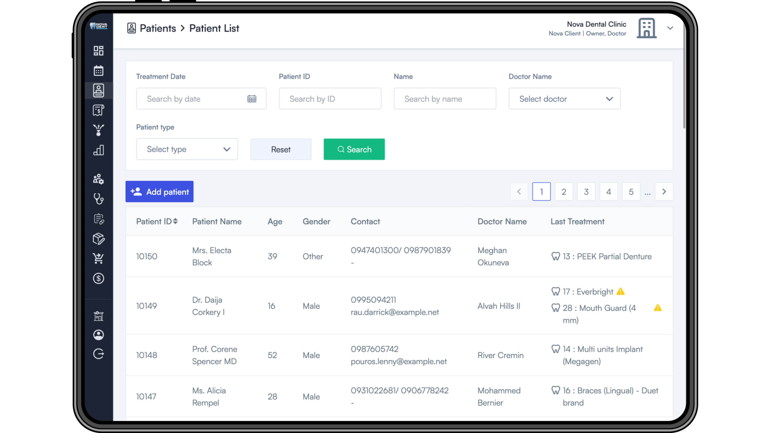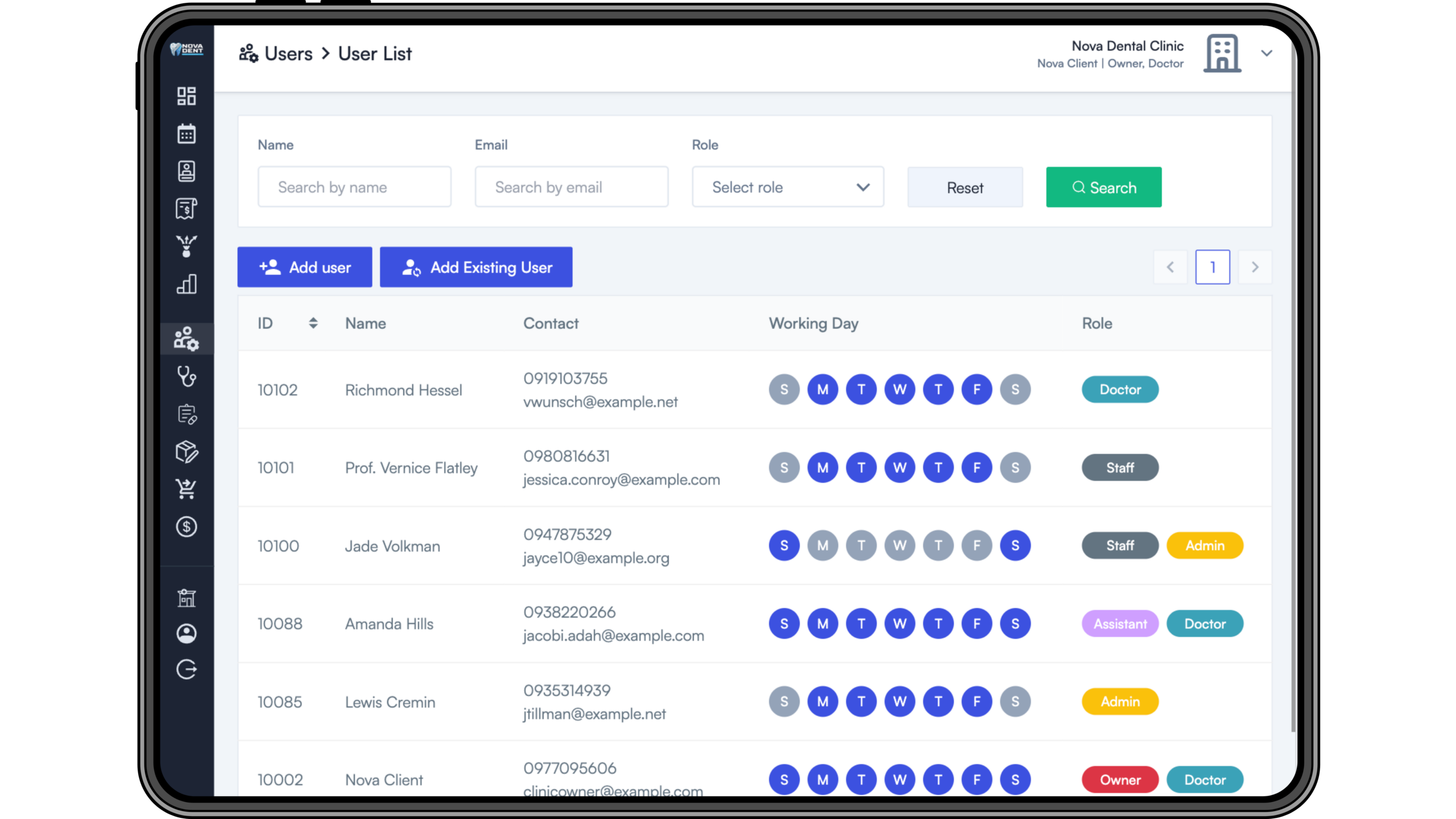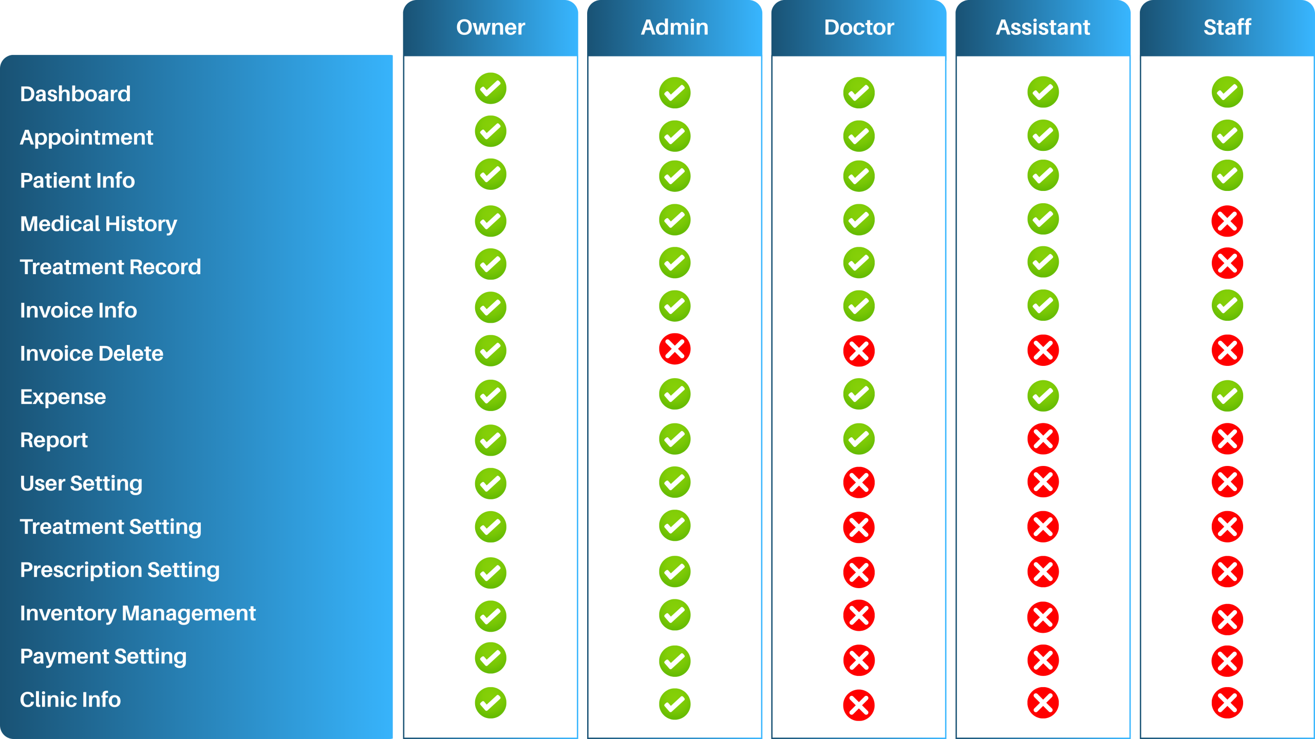 Nova Dent helps you manage user roles. Each role has customized permissions and dashboards to prevent internal data leakage and ensure smooth operations.