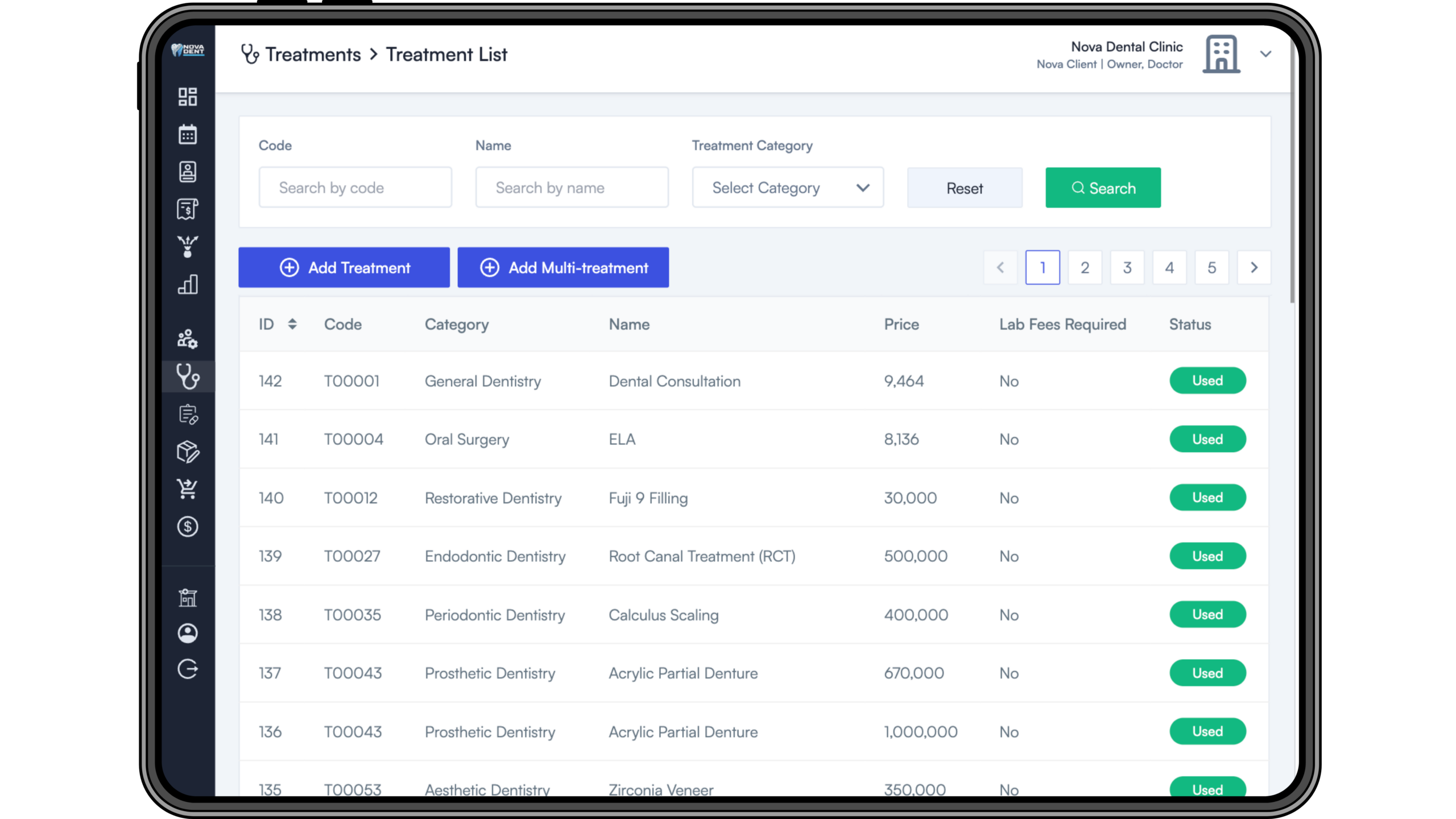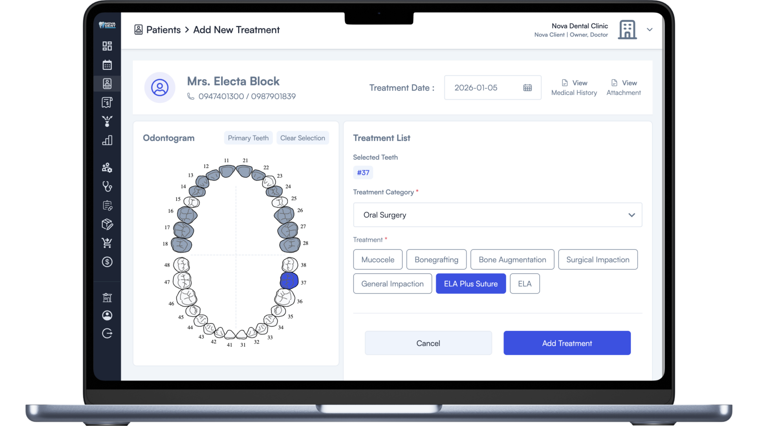 Nova Dent offers an intuitive treatment management interface with an interactive dental chart for precise tooth selection. Dentists can quickly add treatments, choose categories, and access patient history and attachments in one streamlined workspace.